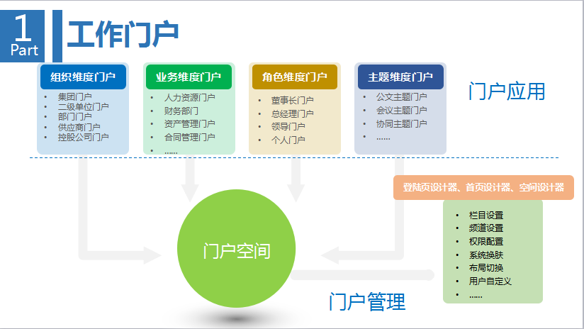 第一環(huán),也是最基本的,企業(yè)內(nèi)部的工作協(xié)作。實(shí)現(xiàn)組織維度門戶、業(yè)務(wù)維度門戶的建立,二元化工作流,知識(shí)的沉淀與分享,企業(yè)文化建設(shè)。